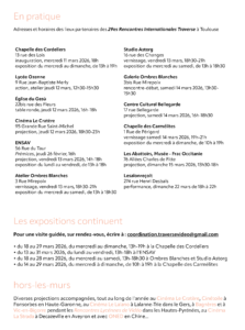Les 29es Rencontres Internationales Traverse, moments forts de l’art expérimental, débutent le 11 mars 2026 à Toulouse. Elles s’amorcent par un marathon réel du 11 au 15 mars dans douze lieux de projections ou d’expositions — Cinéma Le Cratère, Chapelle des Carmélites, Chapelle des Cordeliers, Les Abattoirs Musée – Frac Occitanie, Centre Culturel Bellegarde, ENSAV, Lycée Ozenne, Librairie et Galerie Ombres Blanches, Studio Astorg, Église du Gésu, Lesalonreçoit. Ces cinq jours riches s’organisent pour les connaisseurs comme pour les curieux avec cinéma expérimental, installations, performances, rencontres d’artistes, ateliers et tables rondes en présence de nombreux artistes toulousains, nationaux et internationaux. Les expositions sont ouvertes aux publics jusqu’à fin mars. Des rendez-vous peuvent être pris pour des actions spécifiques.