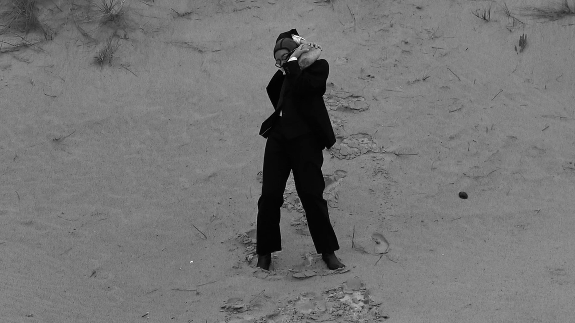 Le geste s’actue devant une projection dans laquelle Sisyphe est saisi dans un décor naturel, luttant avec son rocher. Ce Sisyphe de l’écran se matérialise dans la salle en interagissant avec le rocher. Son corps souffre sous le poids de celle-ci et exprime son désir de s’approprier ce poids et de le dominer. Sa capacité à comprendre (finalement) que cette action absurde est une imposition étrangère à sa volonté, et que cette pierre fait partie de son essence.