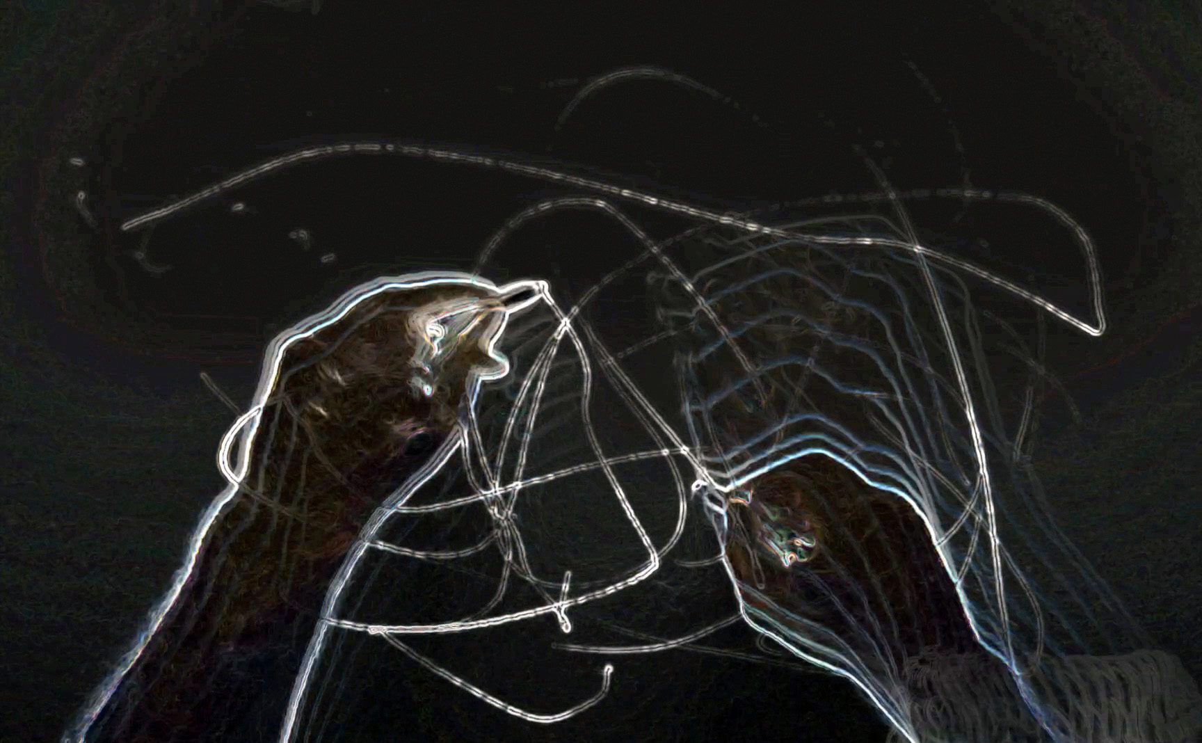 inconsolable se focalise sur la chorégraphie des mains ; un jeu d’artefacts et des textures animées instaure une relation réversible entre l’écran des surfaces transparentes et l’écran de projection. »