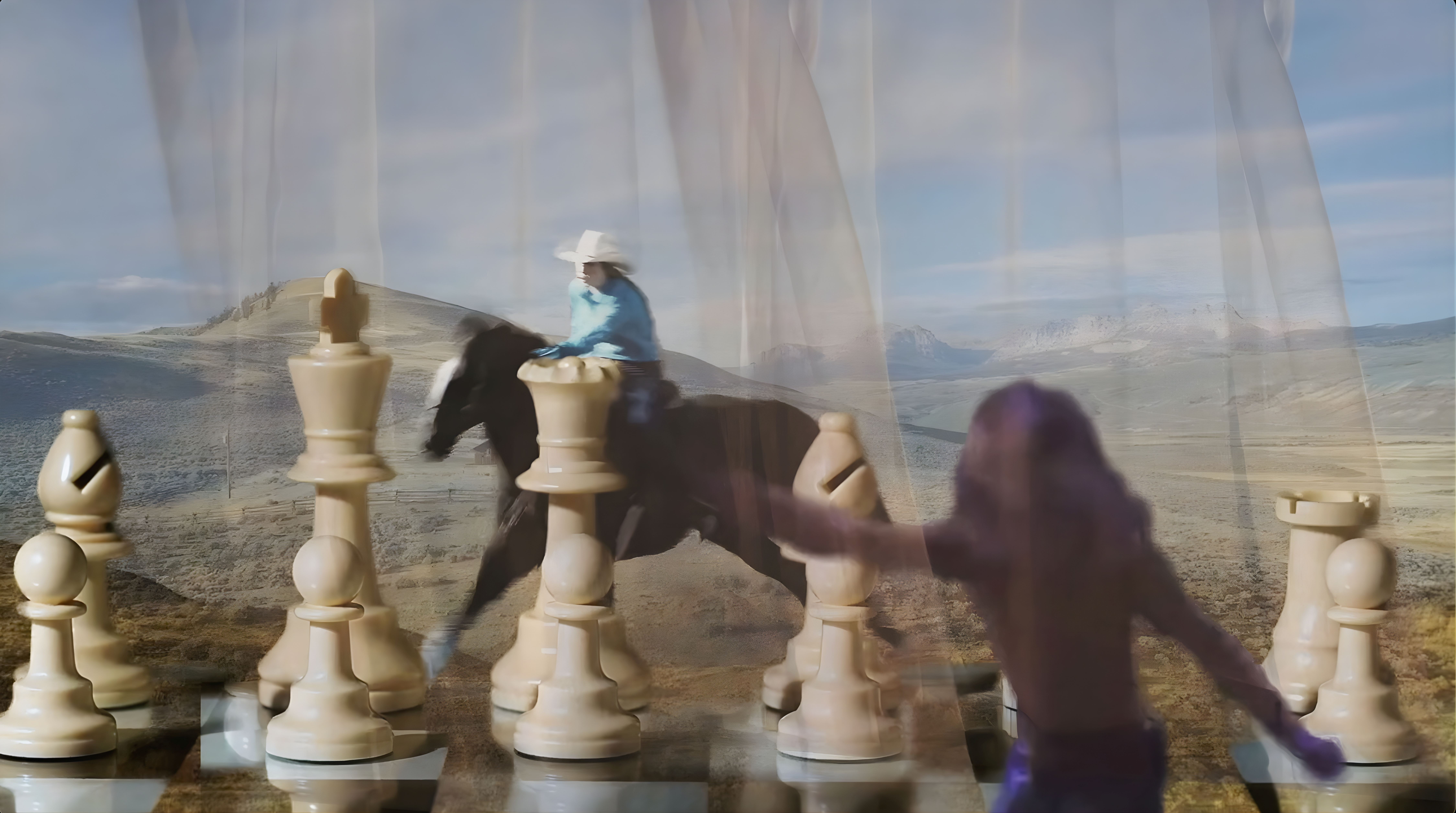 Une petite fille sur un plateau d’échecs, dans le monde de l’espace et de la matière déployée. L’épisode avait été suffisamment bref pour qu’il se dissolve dans la bande-images des souvenirs et de la normalité la plus ordinaire, et qu’un basculement «de l’autre côté» n’advînt jamais. Ses pieds suivaient alors des lignes invisibles tout en évitant soigneusement certains espaces qu’elle était seule à voir, ou plus précisément à sentir. Ses mains s’attachaient à battre un rythme silencieux en touchant des objets selon un tempo par ailleurs imperceptible, dans un probable élan de ré-ordonnancement et d’harmonisation d’un monde qui lui avait toujours paru discordant, voire chaotique. Une tendance, enfin, à s’échapper hors du temps et de l’espace, en s’engouffrant par le point de fuite de la ligne d’horizon. Dans l’apparente promesse d’infini de la musique, ou dans les histoires qu’elle inventait. Ce sont précisément une musique, des paroles et une conversation familiale qui font ressurgir de tels TOC et ces fragments d’enfance en partie oubliés dans une forme stop … mais un «faux stop» sans enjeu de promotion. Et le «sonore» autant que mes propres souvenirs deviennent la source du mouvement des images.