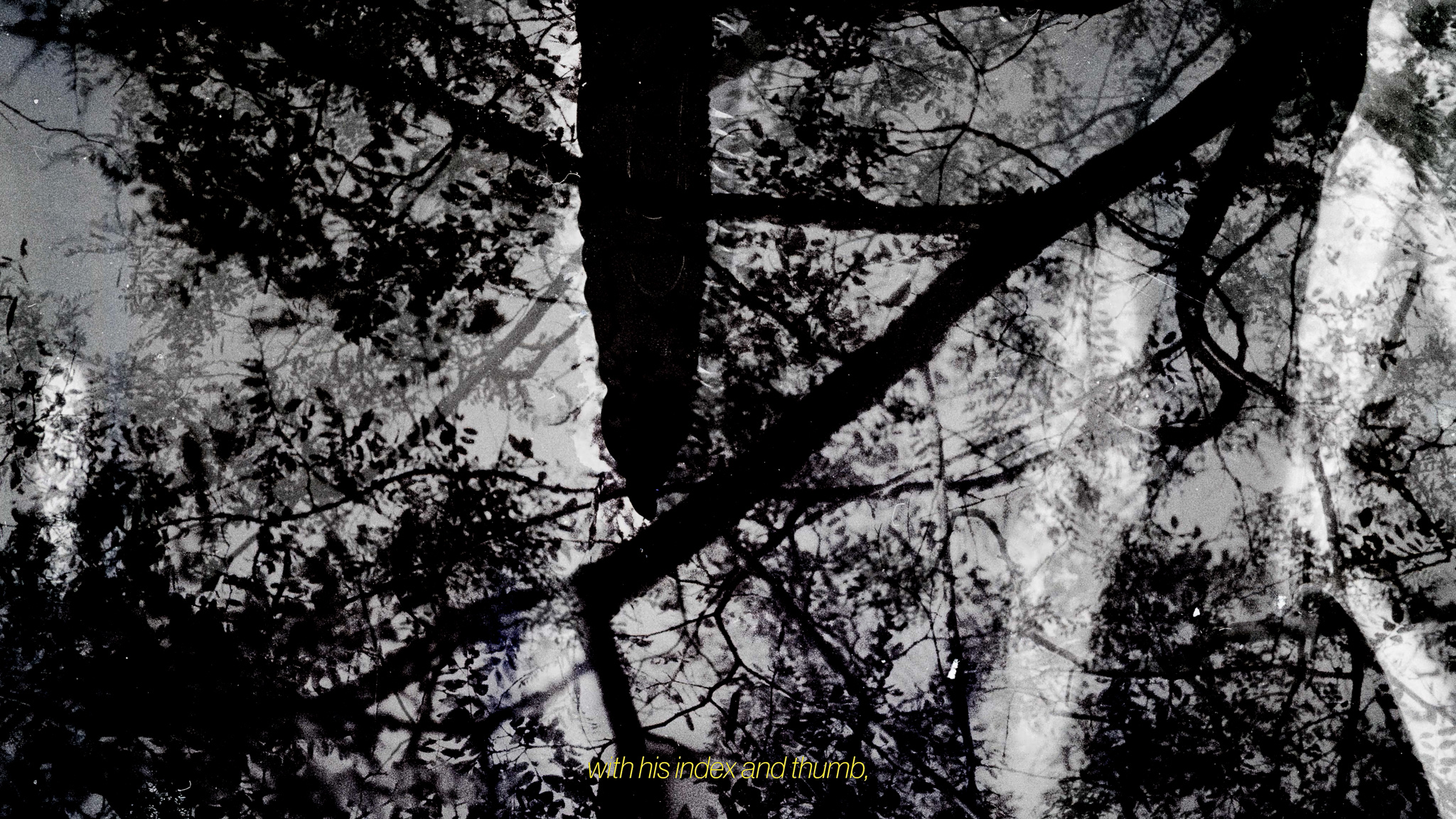 Through a mixture of digital video and animated experimental analog photographic work, the mechanism of the camera, proxy of the eye, is dismantled. With minimal silent narration, the film invites the viewer onto an immersive journey—across green landscapes devoid of green, torn film and torn out eyes, and vegetal corpses — to rediscover the limits of their own vision and explore novel ways of presenting nature devoid of the human gaze.