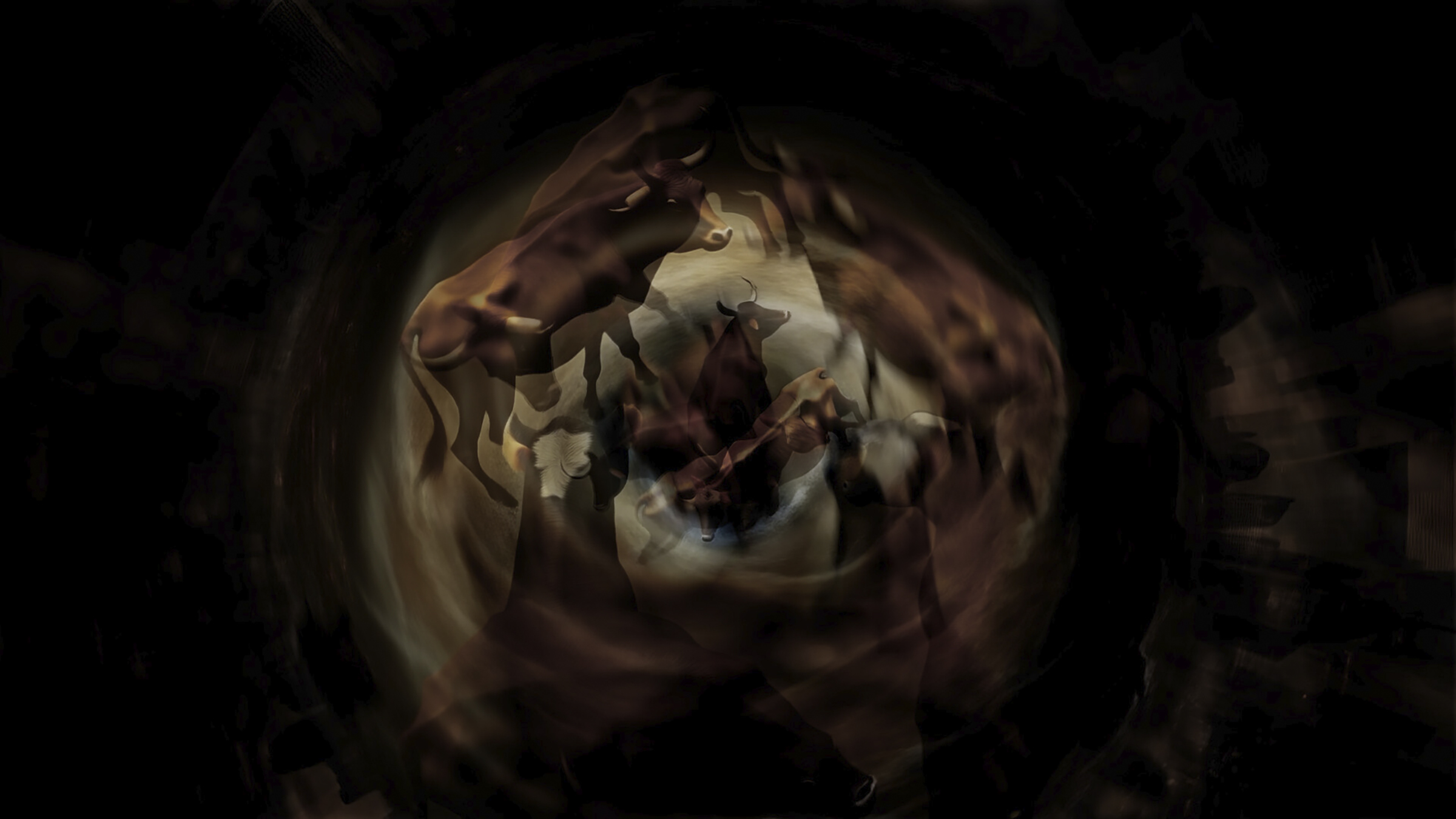 Echoed in Water, 2025, film, 2’26 (IL), « Echoed in Water réinvente Saint Elizabeth’s Day Flood / L’inondation du jour de la Sainte-Élisabeth *, tableau du XVe siècle retenu comme trace d’un traumatisme historique et comme présage contemporain. Combinant des images générées par l’IA inspirées du tableau et des séquences vidéo modernes, le film efface les frontières temporelles : des églises gothiques côtoient des tours de verre, des villageois rament à côté d’androïdes, et des eaux boueuses déferlent à la fois sur des villes anciennes et des horizons contemporains.