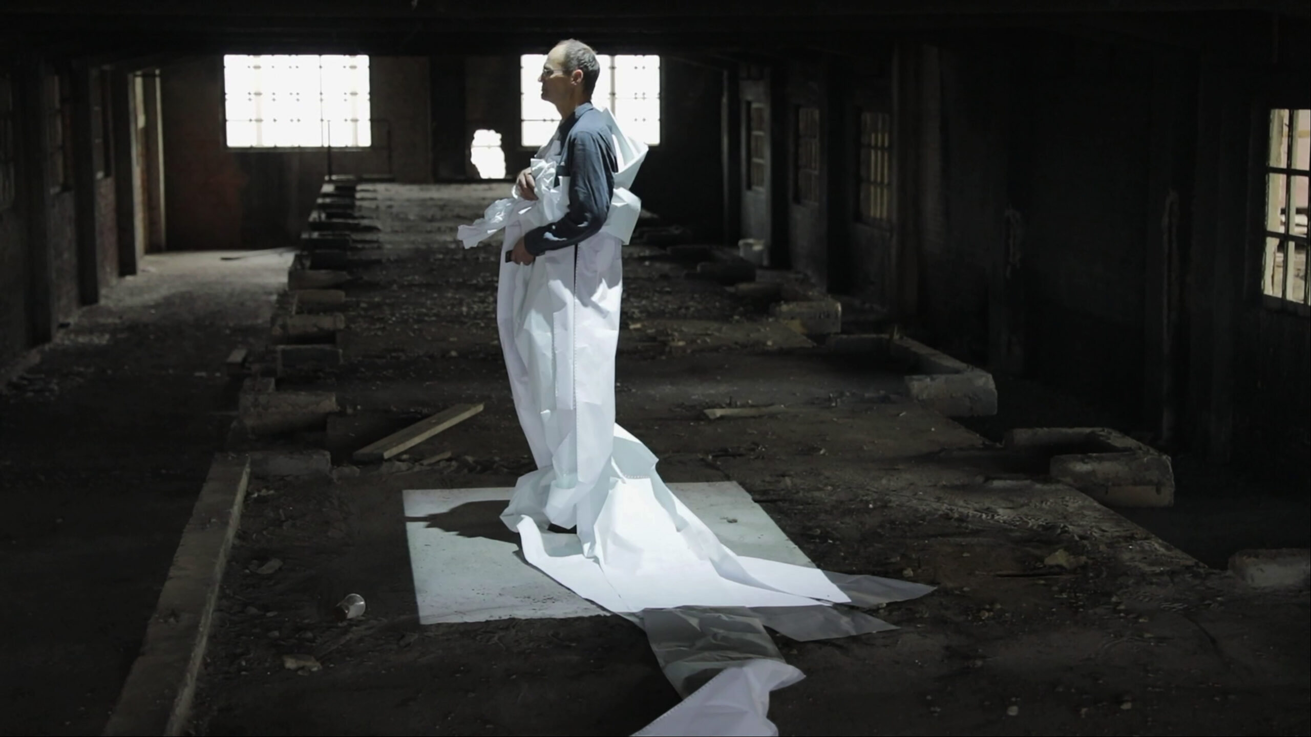 Un homme pénètre en un lieu Urbex, le bâtiment le vit comme une intrusion dont il lui faut se défendre. Le matériau papier s’éveille aussi au-delà de ses connotations et ce , sans ménagement. Échappant au pire, l’intrus doit néanmoins admettre qu’il n’est pas aux normes mais non pas vaincu, il reprend force, s’habille de prestige, jusqu’à se persuader qu’il agit sur le monde, avant de finalement renoncer. Et alors que son vêtement s’éparpille au vent, le monde extérieur reprend sa course…