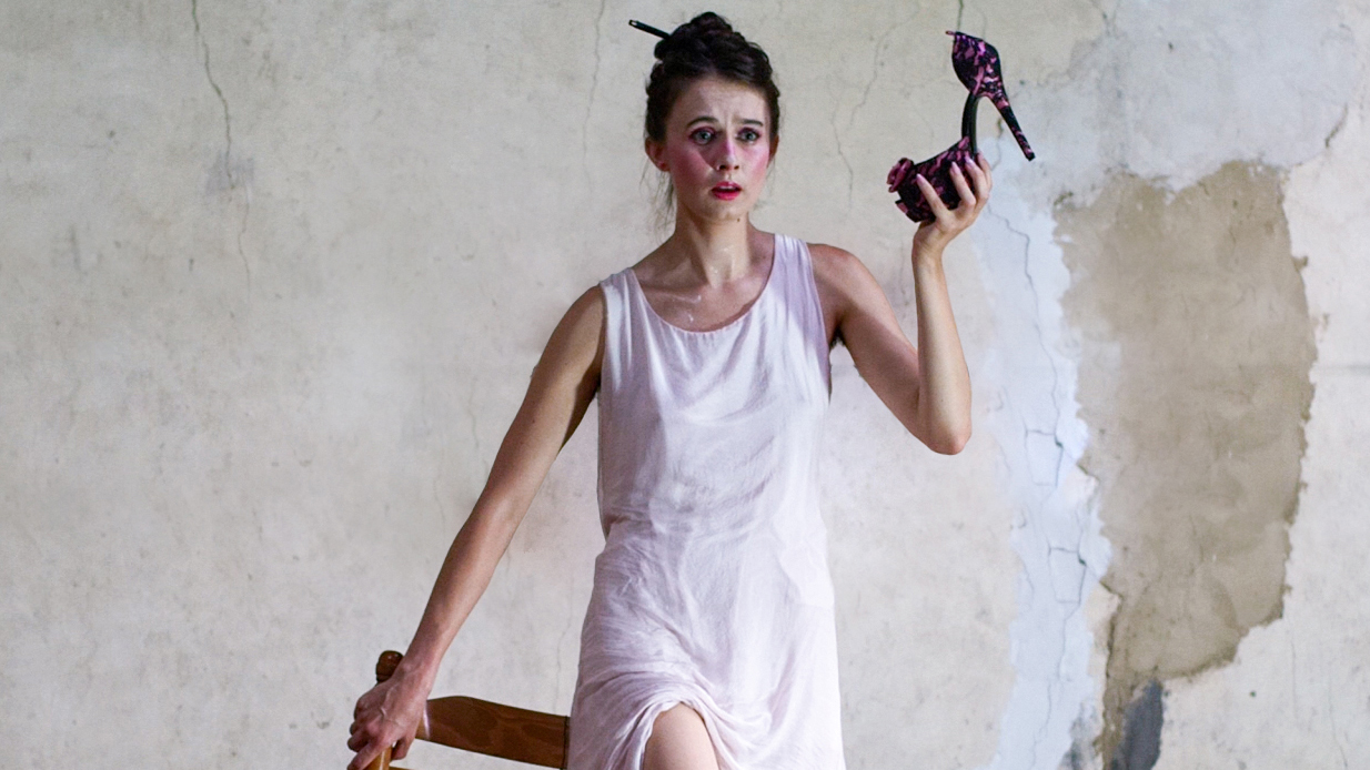 Toujours en déséquilibre, la performeuse soutient le regard du spectateur : l’image de la “good girl” se transforme en question troublante sur la construction sociale du féminin, entre norme et instinct.