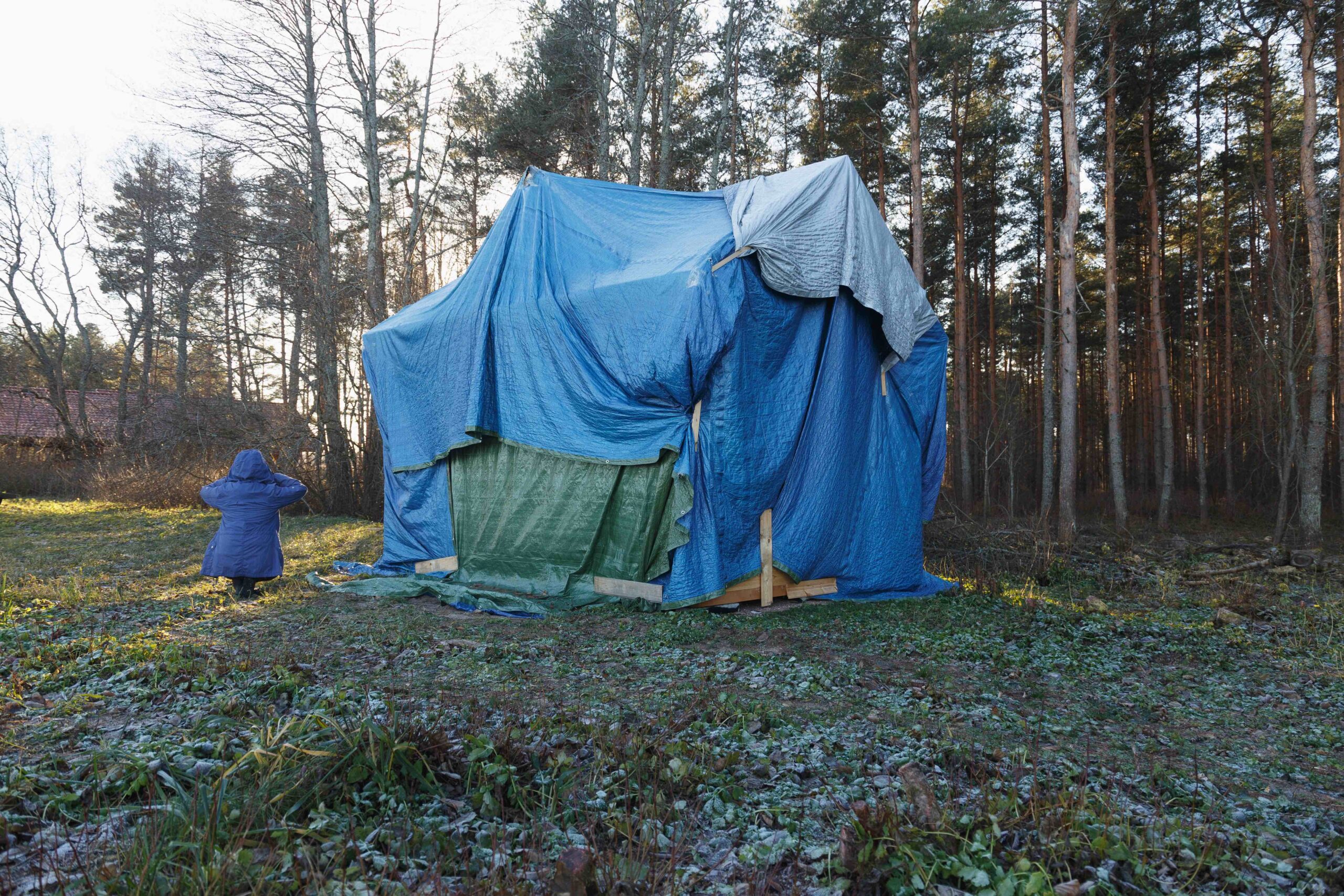 Habit-A, 2021, Photographie (FR) : « Dans ma pratique, le vêtement est un moyen d’interroger le corps ; corps moral, politique, physique et psychique. Je mets en scène des sculptures vivantes. Les corps sont dissimulés dans l’espace par mimétisme des formes et des couleurs. Ce sont des actions de courte durée, in situ, que je mène moi-même ou par une tierce personne dans l’intention d’incarner le paysage. Mes protagonistes sont immobilisés sous un vêtement pour se fondre dans la nature ou pour imiter l’architecture. Je mesure l’espace avec le corps en rapport aux théories de l’architecte romain Vitruve ; le corps humain est le point de référence à partir duquel l’architecture est construite. La notion d’abris apparaît en filigrane dans cette série à travers le choix des architectures et les habits protecteurs des protagonistes, pour mieux révéler l’impact de l’architecture sur notre vie. »