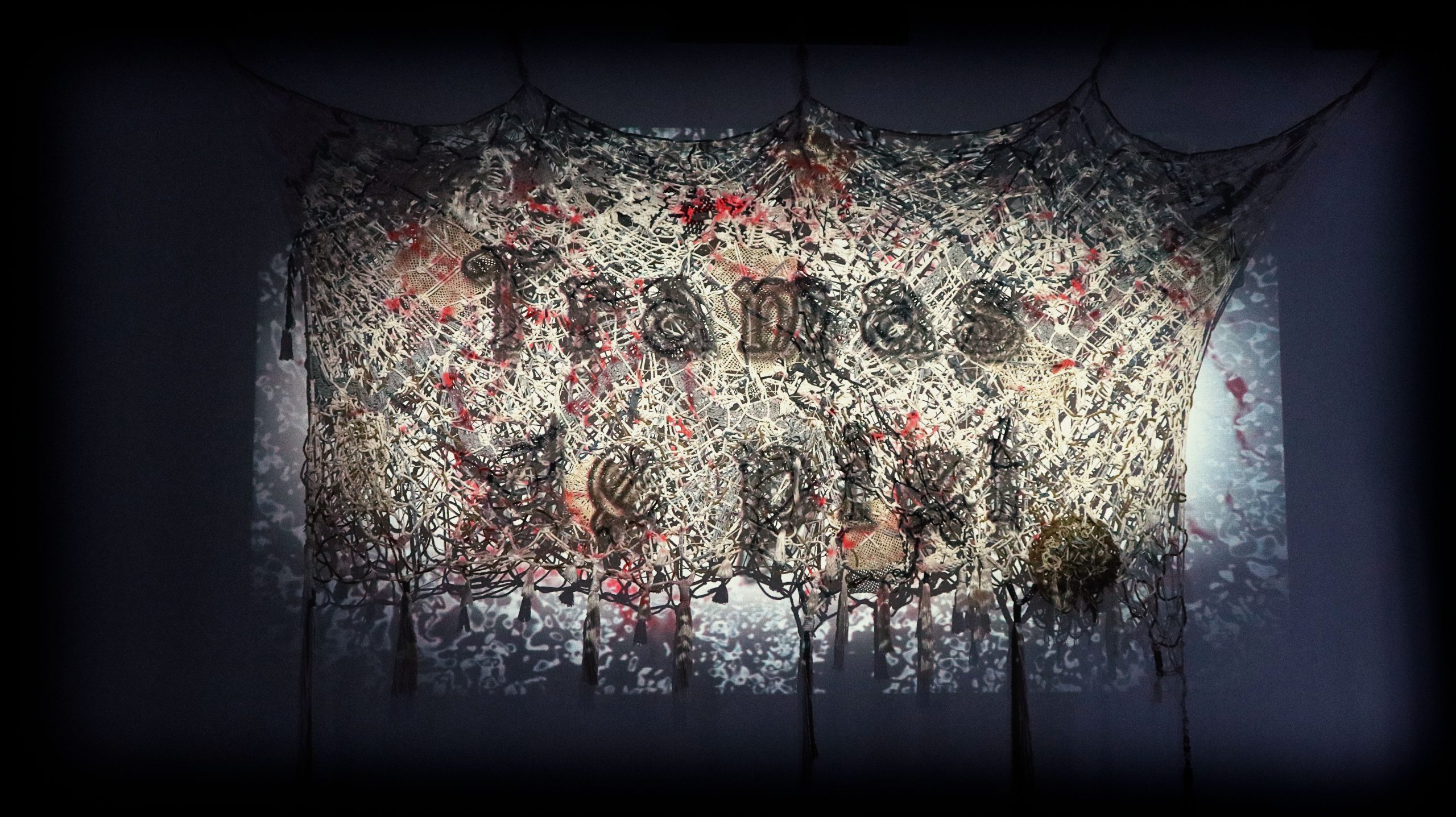 Tramas de piel explora la noción de red afectiva a través de la metáfora del tejido, una práctica que evoca la dedicación y paciencia implicadas en la construcción de vínculos interpersonales. El tejido también ilustra la idea de relaciones afectivas horizontales, inclusivas y no competitivas, y sus diferentes texturas sugieren los múltiples matices del cariño. Se genera de esta manera la imagen de una geografía de afectos, variada y compleja en sus sensaciones. El proyecto se nutre de los testimonios de siete personas que fueron entrevistadas durante el proceso de elaboración del tejido, y con cada una se compartió un espacio seguro para hablar libremente de cómo concebían sus afectos. Sus voces y sus manos son incorporadas en la videoinstalación respetando la privacidad de sus testimonios : no se comprenden los diálogos y la transcripción de las entrevistas está escrita en líneas de tela que han sido tejidas en la superficie de proyección. La única manera de leerlas sería desarmando el tejido.